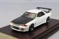 スカイラインGT-R ニスモ(R32)を1/64スケール レジン素材でモデル化。 ボディカラーホワイト。 TE37タイプ18インチホイール(ポリッシュ&ガンメタリック)にローダウン仕様。 ボンネット・トランク(共にカーボン調)。GT-R NISMO純正エアロパーツ、GT ウィング、大径マフラー装着。ブラウンのレザー調ディスプレイ台座にゴールド のアルミプレート付。