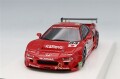 1995年、伝統のルマン24時間レースに3台のNSXが持ち込まれました。 GT-2クラスにはチーム国光とチームナカジマの「NSX GT-2」がエントリーされました。 84号車は予選でクラス3位のポジションを獲得しましたが、決勝レースのウォーミングアップ中にミッションオイル漏れが発覚し急遽ピットイン。 残念ながら最後尾からのスタートとなってしまいましたが、土屋選手の猛烈な追い上げで一台一台パスして行きました。 2スティント目で飯田選手に交代しましたが、今度はエキゾースト本体の破損によりスローダウン。 またもピット作業を余儀なくされます。 エキゾーストを交換し、しばらくは順調に走っていましたが、日を跨いだ深夜3時頃またもトラブルが発生し左側のヘッドライトが切れてしまいました。 コースがよく見えない状況ながら良いペースで走っていたので、チームはこの状況に耐えて走ることを決断します。 午前5時前に給油のみのピットインを行いコースに戻りました。 最後尾からスタートしたNSXは2日目正午には総合8位、クラス1位にまでポジションアップしそのままクラス優勝の快挙を成し遂げました。 【モデル解説】モデル化にあたっては、ホンダコレクションホールが所蔵する実車を取材。 3Dスキャンに加えて、大量の資料用写真を撮影し、その迫力や佇まいも原型に反映させることを目指しました。 ボディは赤を基調としながら、TEAM KUNIMITSUのグラフィックスやロゴステッカーなどがあしらわれています。 これらはいずれもデカールによる再現で、上からクリアコーティング塗装を施して、さらに表面を研磨することで鏡面仕上げとしました。 ウィングはカーボン地肌がレーシーな仕上げですが、こちらはエッチングパーツを2枚重ねてプレスしたパーツにカーボンパターンのデカールを貼り、上からクリアコーティング塗装を施して実車さながらの雰囲気を演出。 ホイールは真鍮切削原型をホワイトメタル鋳造部品に置き換えたシャープな造形が見どころとなります。 アノダイズド加工されたセンターロックナットの青(右サイド)と赤(左サイド)の色味にも拘っています。 ノーマルの面影をほとんど残さないスパルタンなインテリアも実車の3Dスキャンデータをベースに造形。 ディテールの再現度だけでなく、シートやステアリングのサイズ感、質感なども実車を忠実にスケールダウンしています。 アクリルベース、クリアケース付属
